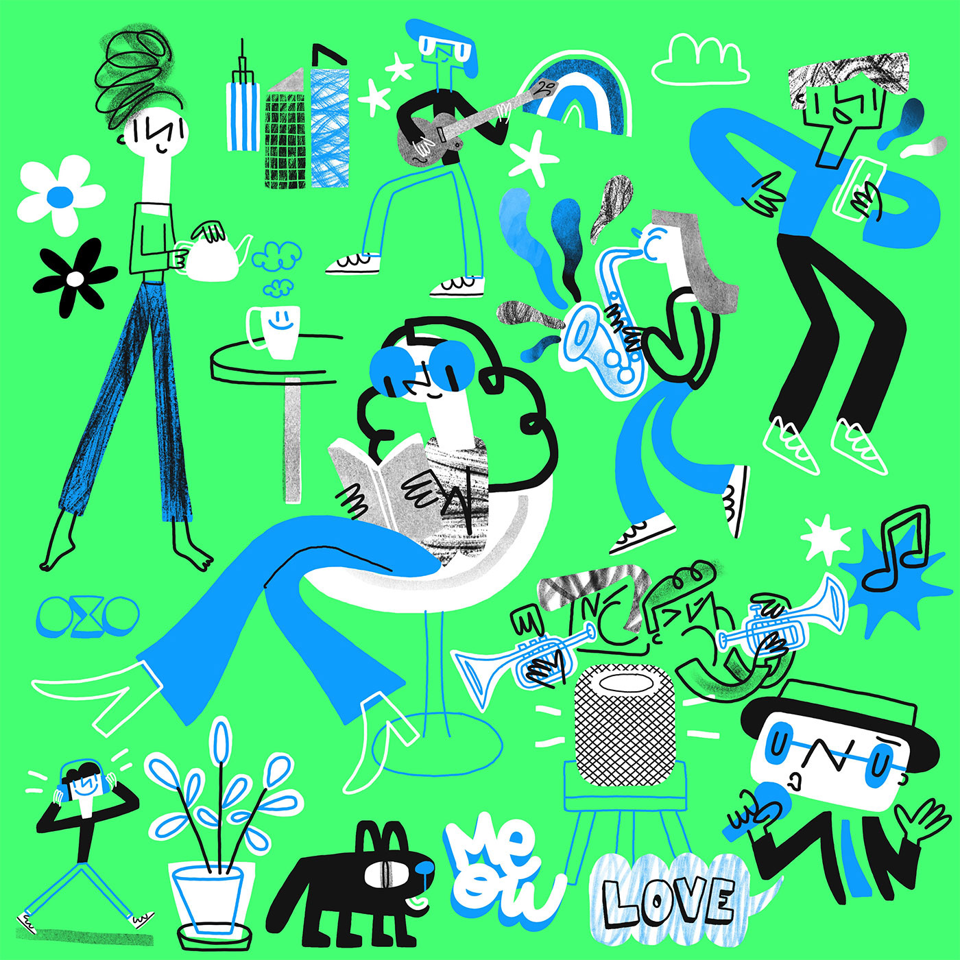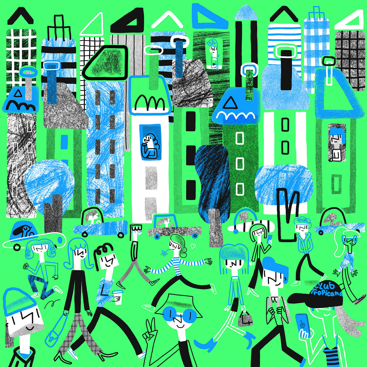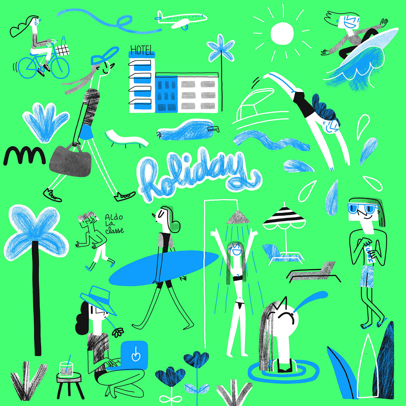 Pour cette série d'illustrations je voulais me limiter dans le nombre de couleurs. Je suis donc partie avec cette gamme assez réduite, qui me permettait de focaliser sur le dessin des personnages et de l'organisation des différents éléments.